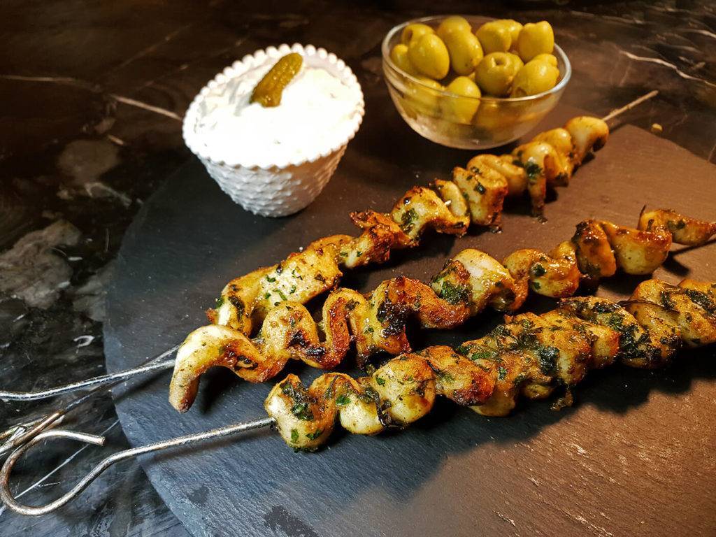 В случае с шашлыком, основной ингредиент следует постоянно поливать растопленным сливочным маслом или лимонным соком. В роли шампуров выступят деревянные шпажки, которые изначально следует замочить в воде, чтобы к ним не приставала мякоть.