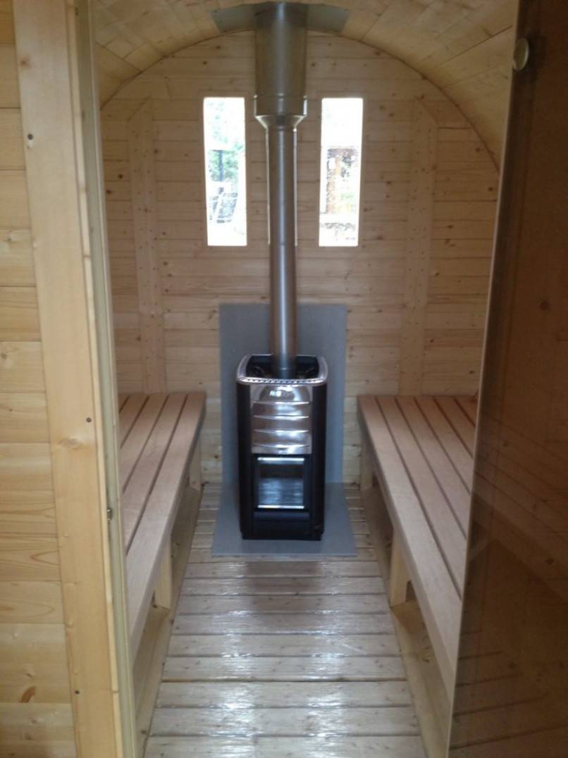 Значительно проще установить в бане готовую печь на твердом топливе и своими руками вывести трубу через стену в бане.