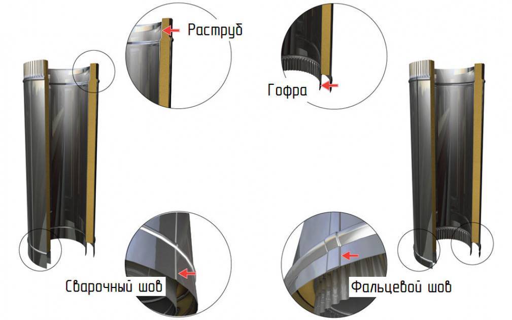 Типы сборки сэндвич труб Как уже говорили выше, одна сторона сэндвич трубы чуть шире, вторая — чуть уже. За счет этой разницы в диаметре модули соединяются один с другим. Если более широкий конец оказывается повернутым вверх (на рисунке справа), сборка называется «по конденсату». При таком способе монтажа капли конденсата беспрепятственно стекают вниз. Недостаток этого метода — при недостаточной герметизации стыков дым может просачиваться в микротрещины. Данный вид монтажа сэндвич-дымохода используют при выводе трубы через стену. Тут как раз и требуется свободное стекание конденсата, а небольшие утечки дыма нестрашны — они на улице некритичны.