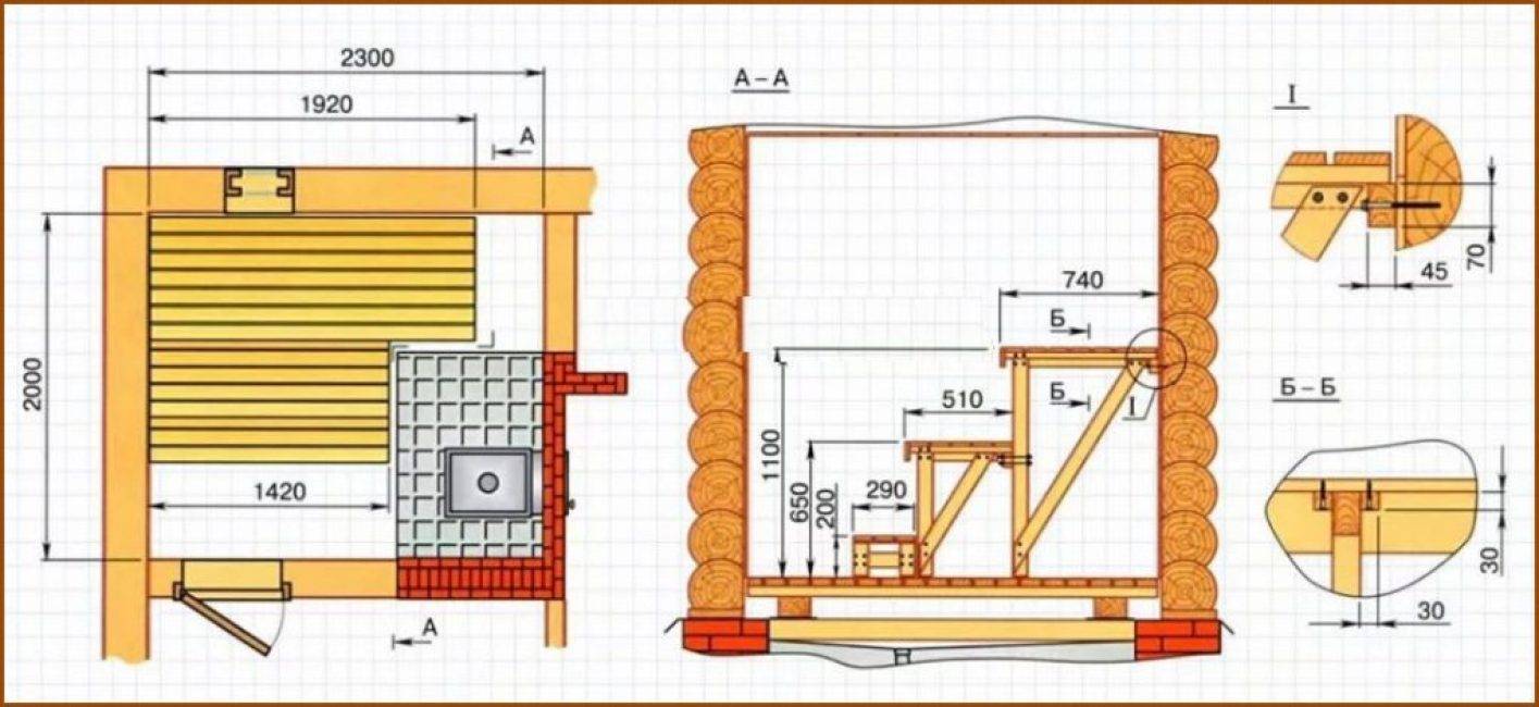 Размеры самой парилки зависят не только от размера полка, но и типа печи. Учесть необходимо также рекомендованное расстояние от нее до сгораемых конструкций (обшивки стен). Это делается в целях противопожарной безопасности.