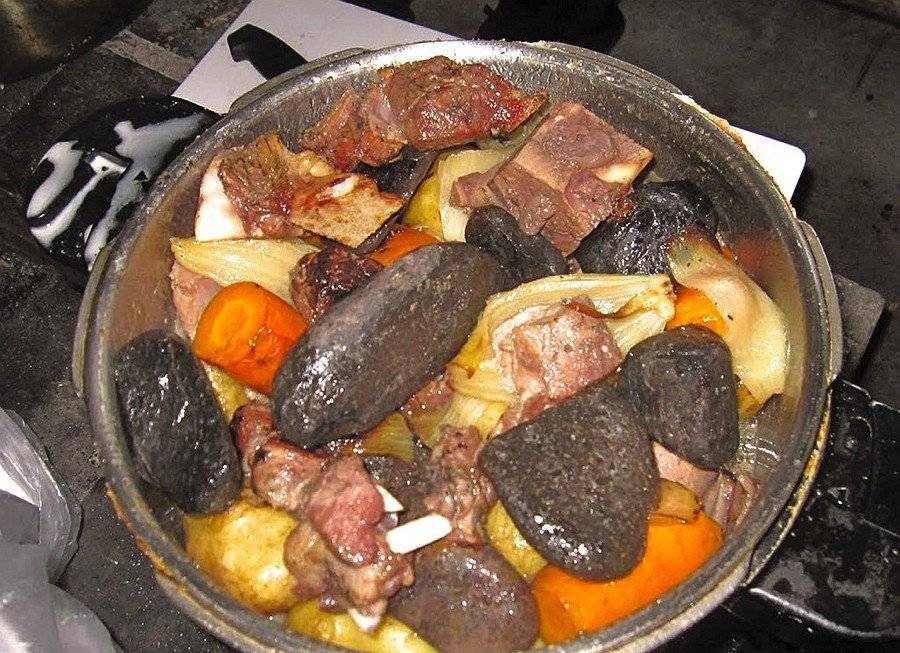 В казан (или бидон) накидывается мясо, порезанное кусками с кулак. Туда же отправляются раскаленные камни такого же размера — прямо к сырому мясу. Закидываем чеснок, порезанную крупными кусками картошку, морковь и лук, заливаем водой (или молоком) и ставим на огонь тушиться. Через полчаса блюдо готово. Получается невероятно нажористое рагу, идеальный вариант для ночных посиделок в лесу.