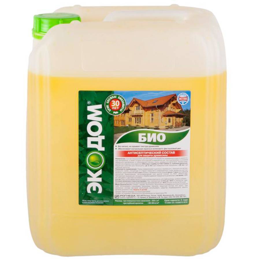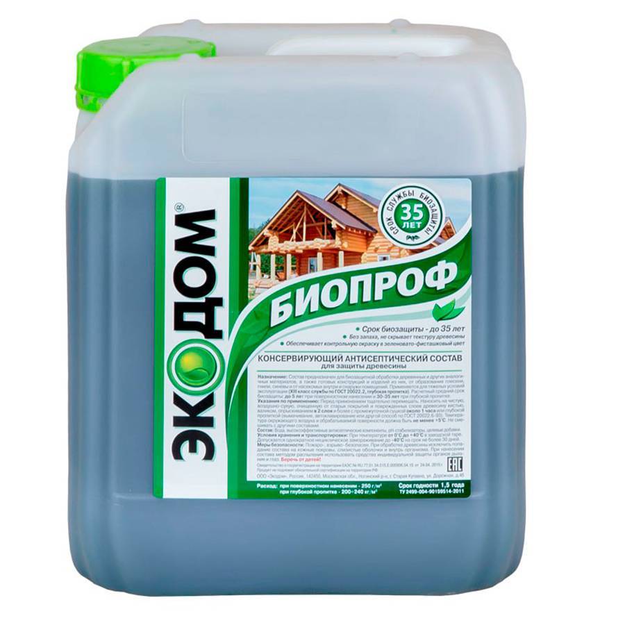 Пропитка с антисептическими свойствами. Защищает дерево от патогенной флоры, насекомых и преждевременного разрушения на срок до 35 лет. Можно использовать под покраску. Наносить смесь можно валиком, кистью или пульверизатором.