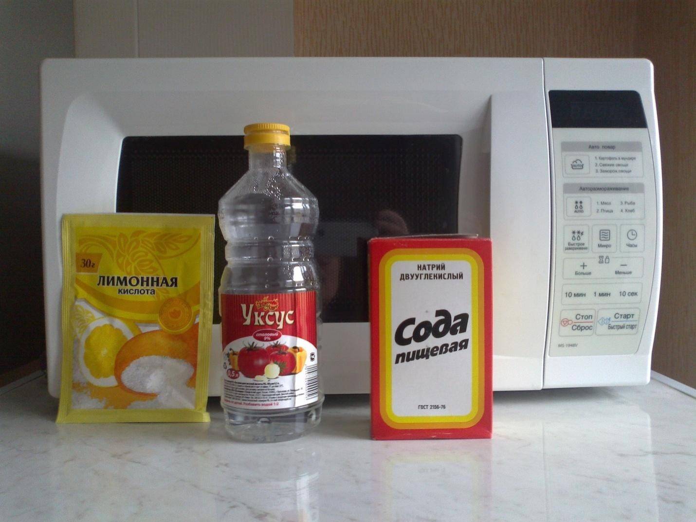 - сода – емкость с содовым раствором (1 чайная ложка на 500мл воды) помещается в микроволновку, устанавливается максимальная мощность на 5 минут. После выключения выдерживают 5 минут, протирают влажной тряпкой.