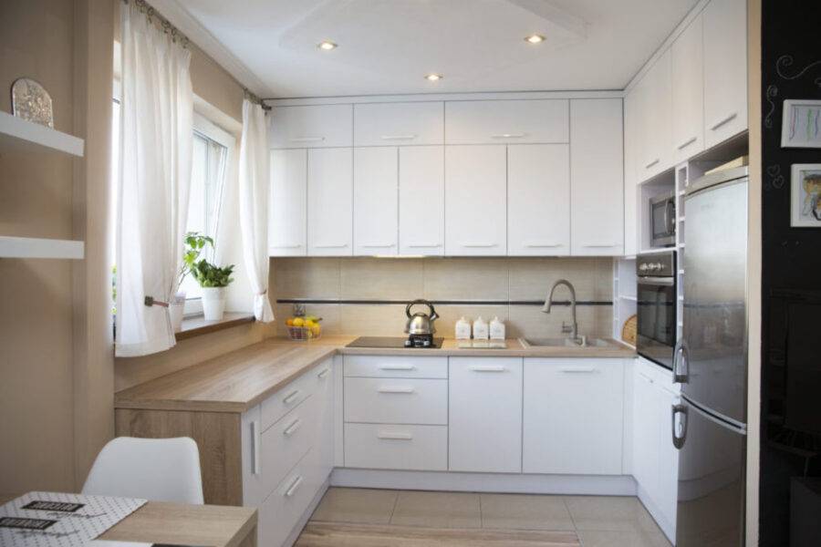 Чем заменить: Для небольшой кухни подойдут однотонные обои, желательно светлые. Чтобы зрительно увеличить и продлить комнату, одну стену можно украсить фотообоями с изображением улицы, пляжа, дороги, то есть любого расширяющегося пространства. Лучше сделать такой декор на стене, у которой стоит обеденный стол.