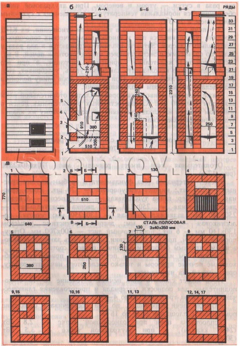 На рис. 1,б даны вертикальные разрезы печи по А—А, Б—Б и В—В, а на порядовках показано, в какой последовательности осуществляются кладка кирпичей и установка печных приборов в каждом ряду.