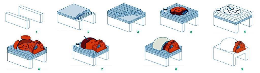 В продаже есть наборы для быстрого строительства малых глинобитных печей для пиццы. В комплект входит набор керамических модулей и связующий их раствор. Постамент с теплоизоляцией и теплоизоляцию купола нужно делать самому. Как собирать такие печи, в общем показано на рис., подробная инструкция всегда прилагается. Стоимость комплекта со стоимостью дополнительных материалов, как правило, не превышает таковой на материалы для самостоятельной постройки, а для желающих попробовать пиццу из глинобитной печи это единственная реальная возможность его осуществить.
