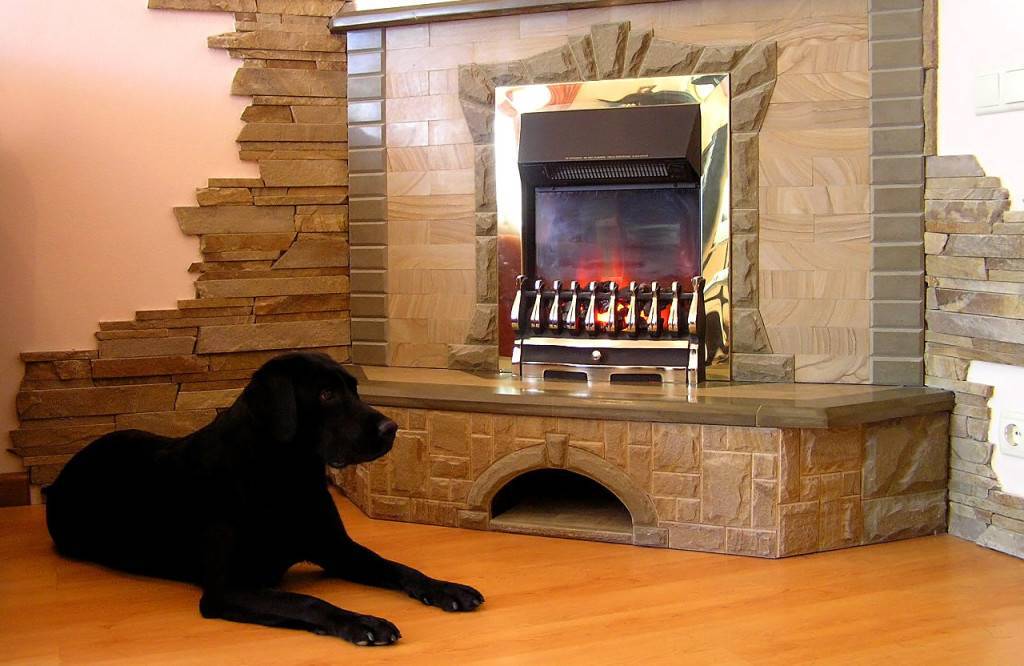 Кроме того, подобный тип камина из гипсокартона нуждается и в обустройстве отдельной розетки. Ну а декорировать его, в принципе, можно чем угодно. Традиционный вариант – искусственный камень, который крепится на клеящуюся смесь. Стандартная штукатурка также актуальна, однако ее придется покрыть краской или лаком.