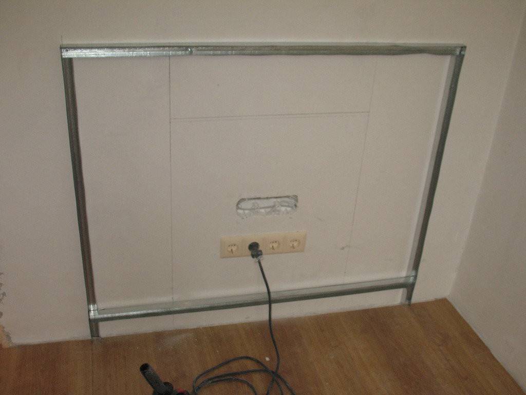 Усиление каркаса (электрические камины из короба являются не самыми легкими конструкциями). Стоечные профили следует прикрепить на основание через 20 см.