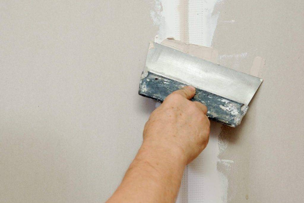 - Далее весь этот «пирог» аккуратно прижимают к гипсокартону и протягивают вверх и вниз шпателем, под углом 70, будет выступать шпаклёвка – её аккуратно убирают.