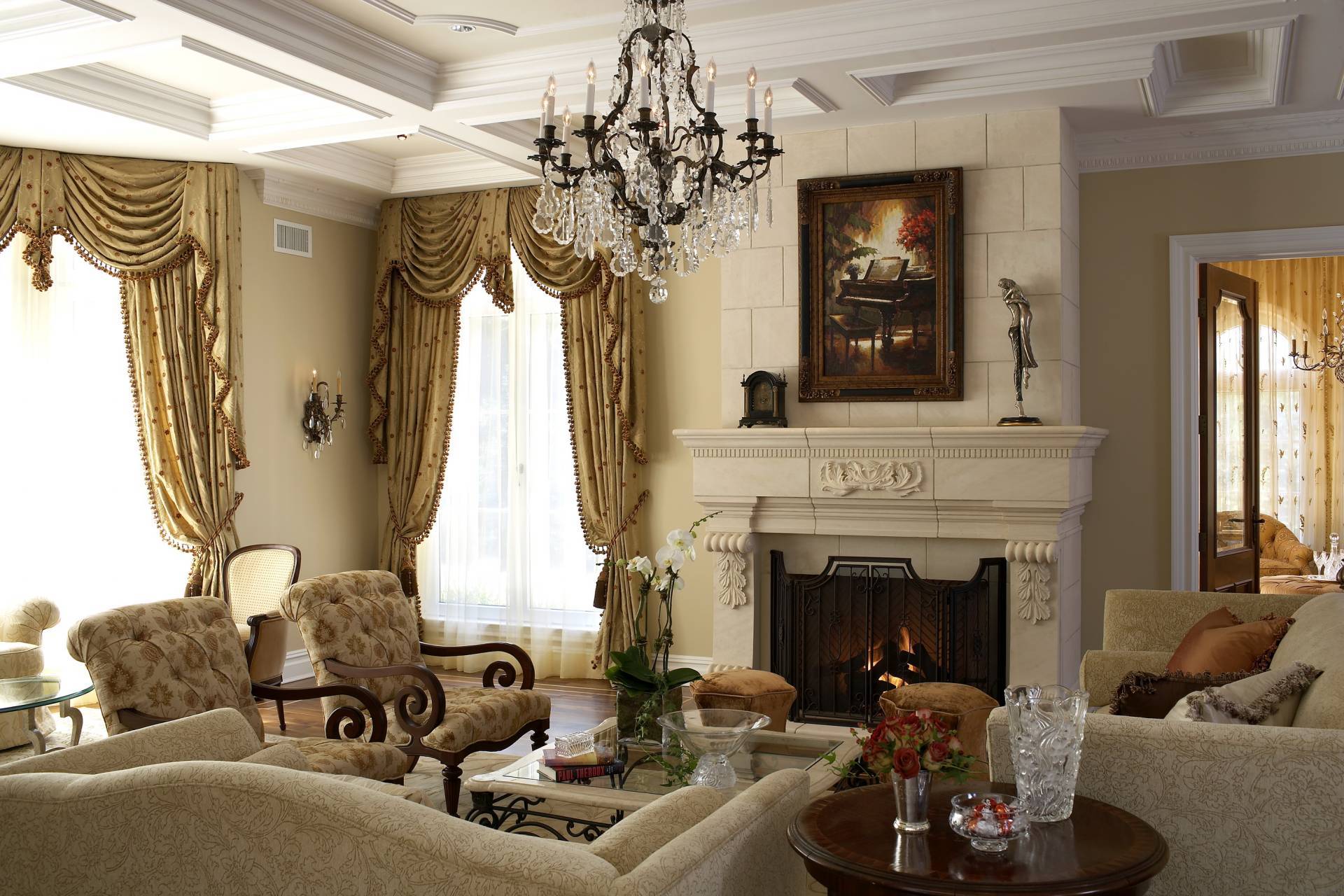 - вычурные детали – массивный камин, лепнина на потолке, зеркальные ниши должны подчиняться общей концепции стиля, не «перегружая» его;