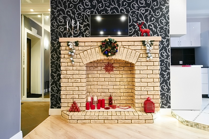 Отделка — самая приятная часть работы по изготовлению фальш камина. Его можно покрасить или оклеить бумагой, подходящими по расцветке обоями, использовать имитацию кирпичей из картона, декоративные элементы, плинтусы или потолочные плиты из пенополистирола. Очень нарядно и празднично смотрится камин, оформленный под красный кирпич; элегантно и благородно — имитация белого, бежевого или серого мрамора.