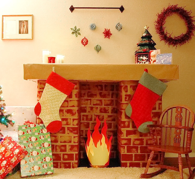 Камин можно просто нарисовать на большом листе бумаги и повесить на стену (пример из классики — знаменитый очаг Папы Карло) или сделать из картона, пенопласта и других подходящих и удобных материалов. Декорировать под благородный кирпич или изысканную лепнину. Добавить «огня», света или звука. Оформить каминную полочку элегантными елочными венками, шарами со снегом и другими праздничными элементами, или повесить над очагом яркие и веселые рождественские носки.