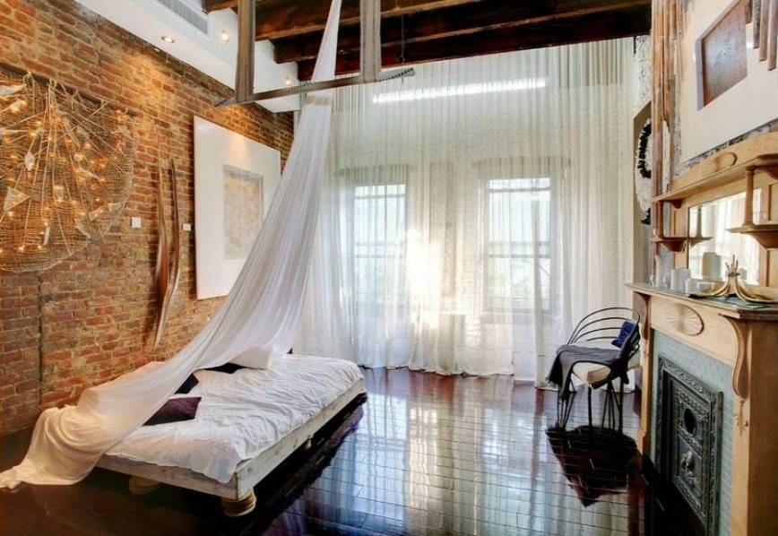 Постельное бельё лучше выбирать однотонное, белого или нейтрального цвета. Контраст можно выполнить, если рядом с грубо оштукатуренной стеной или кирпичной кладкой будет соседствовать нежный невесомый балдахин. Несмотря на всю абсурдность, нелишним будет и камин или его имитация.