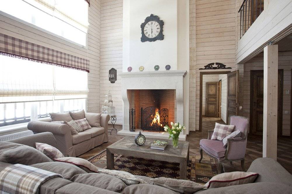 Мебель в такой гостиной обычно светлая, изящная, с резными элементами. Это могут быть мягкие удобные диваны и кресла, старинные комоды и буфеты, книжные полки. Приветствуется обилие декора, кованых элементов, а также «состаривание» предметов. Общую обстановку дополняют плетеными корзинами, винтажными часами, большими вазами, декором ручной работы — вязанием, вышивкой, поделками.