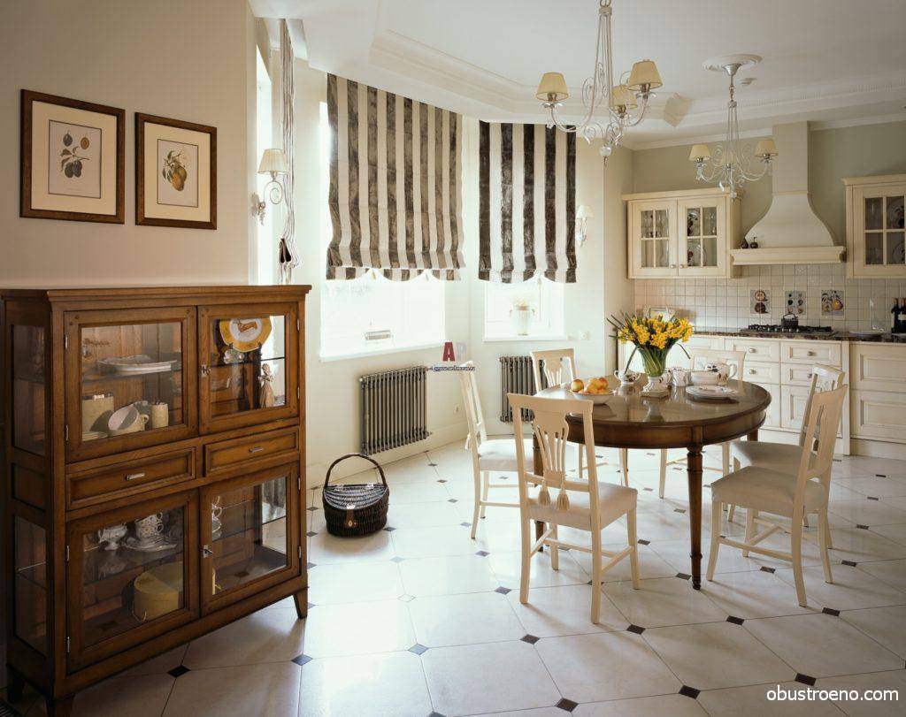 . Кухня должна быть просторной, светлой и не лишенной нотки роскоши. Мебель, в особенности обеденный стол и стулья, должна быть массивной и деревянной, шкафчики могут иметь филенчатые дверки, фигурные ручки. Также можно выставлять светлую посуду и кухонную утварь на виду, и использовать много текстиля – например, сделать своими руками подставки под чашки, прихватки.