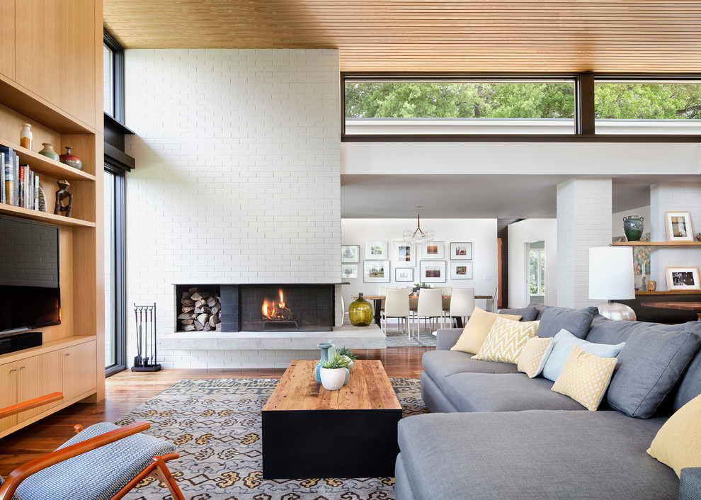 Двусторонний камин – идеальное решение для просторной гостиной или объединённых комнат. Дизайн Architectural WorkShop