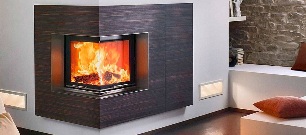 В большинстве случаев это пристраиваемые очаги, дымоход которых располагается у стены, что открывает простор для творчества и позволяет пофантазировать, разрабатывая дизайн. Среди каминов для дома, которые относятся к дровяным полуоткрытого типа, нередко можно встретить проекты, в которых отсутствует одна или две боковые стенки, на фото видно, что такое решение позволяет открыть наилучший обзор пламени. В отличие от закрытых, они отдают значительно меньше тепла, это связано с тем, что в дымоход уходит много воздуха из помещения. Но радиус отапливаемой площади у этих моделей несколько больше. Среди них выделяются угловые камины для дома дровяные, которые позволяют задействовать малоиспользуемое пространство в углу и одновременно обогревать две смежные комнаты.