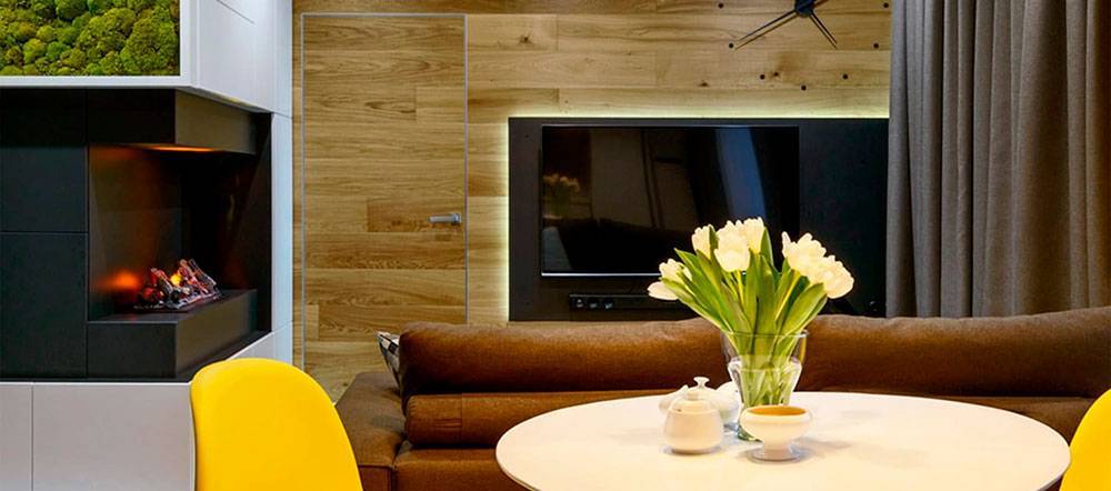 Если в гостиной стоит большой угловой диван, яркие элементы располагаются на противоположных друг от друга стенах так, чтобы пламя не отражалось на экране.