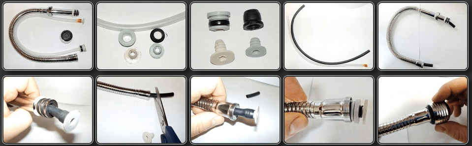 В случае установки гибкого излива проблема может возникнуть как в месте его присоединения к корпусу (ремонт поломки рассмотрен выше), так и в самом шланге. Чаще всего повреждается гибкая трубка, расположенная внутри гофрированного металлического шланга. Ремонту она не подлежит, можно только заменить элемент. При повреждении самого гофрированного шланга менять требуется либо гибкий излив целиком, либо шланг вместе с внутренней трубкой.