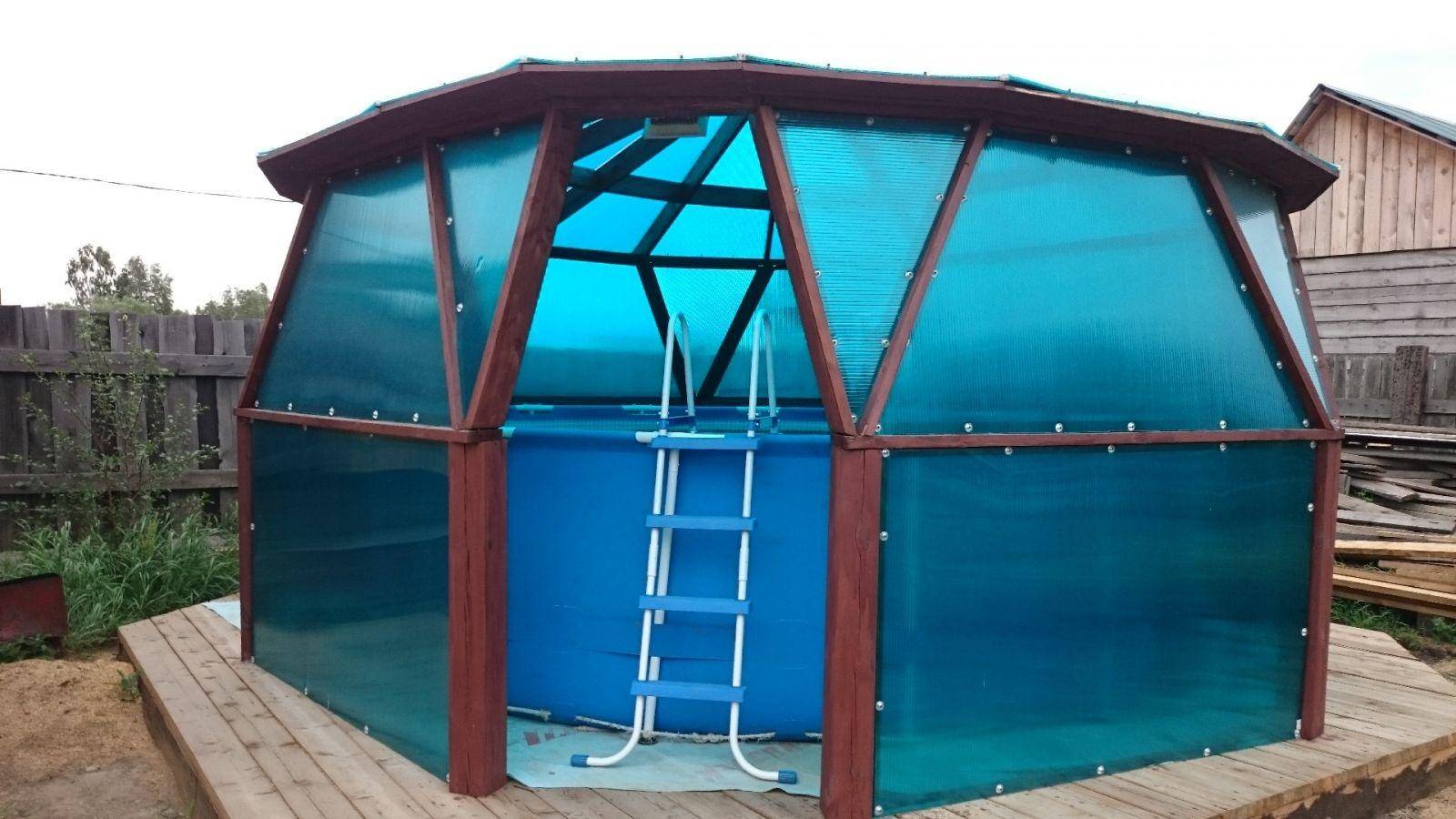 Подняв стойки выше уровня бассейна на 1,5…2 м, можно натянуть над ним тент или установить навес из поликарбоната.