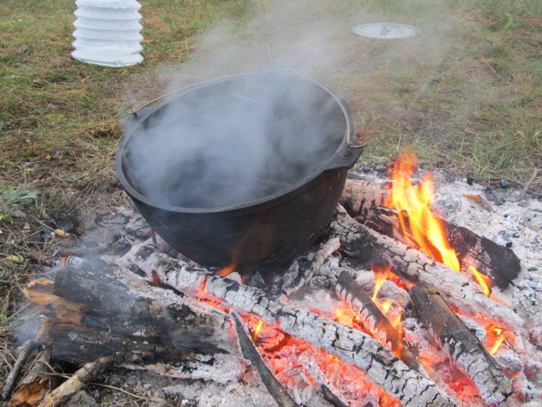 - Нужна высокая температура, чтобы масло кипело. Для этого следует разжечь достаточно большой костер и ставить казан при наличии пламени, а не углей.