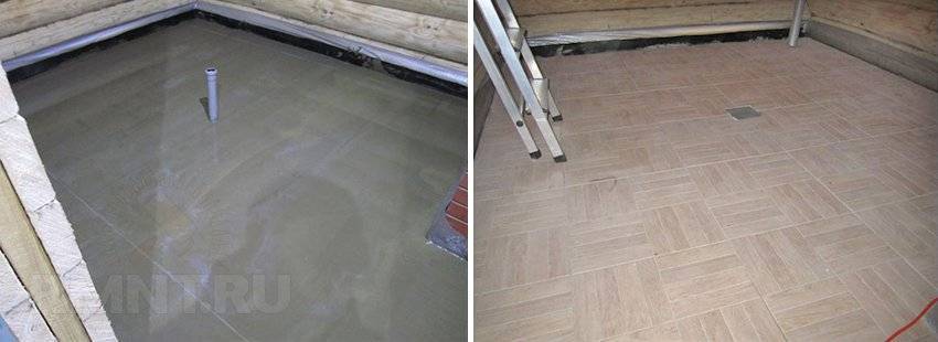 Первый вариант — настил 50 мм слоя войлока, керамзита или шлака, поверху 50 мм слой бетона с формированием уклона к отверстию слива. После схватывания бетона его нужно выровнять раствором цемента, после чего можно приступать к плиточным работам. Второй вариант — 50 мм цементная стяжка, содержащая перлит (вспученный песок). Состав смеси: перлит:цемент:вода как 5:1:3. По прошествии полной недели с момента укладки перлитобетона, наносим поверху 30 мм слой бетона с уклоном под слив