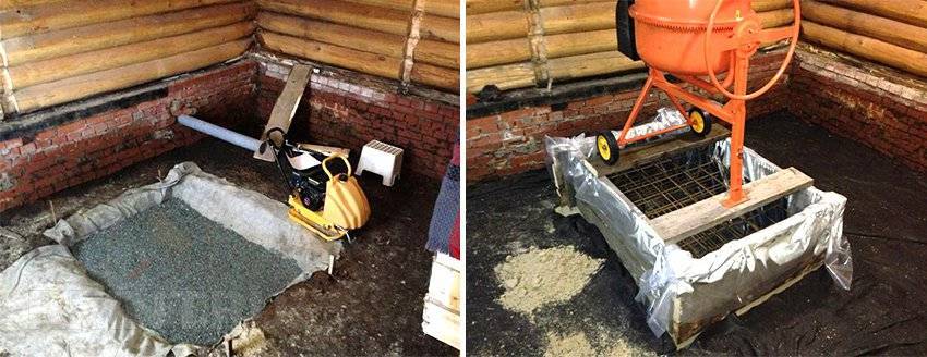 Важно! Перед формированием основания для опоры лаг необходимо выполнить фундамент для печи-каменки и выстроить систему канализации. Древесиной для лаг может быть дуб, лиственница или хвойные породы, лаги следует обработать гудроном или антисептиком до установки