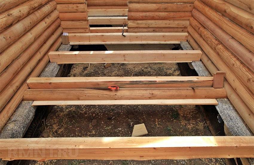 При значительном подъёме цоколя бани над уровнем грунта (от 300 мм), для настила пола потребуются деревянные лаги квадратного сечения (сторона 150 мм). Если размеры помещений бани не превышают 2000х3000 мм, то опорами для лаг будут брёвна оклада. При больших размерах потребуются дополнительные опоры для половых лаг, они представляют собой столбы из бетона или кирпича (250х250 мм) и размещаются на дистанции в 700–800 мм. Опорные столбы для лаг нужно выставлять на многослойное основание из песка, щебня и бетона — каждое по 100 мм.