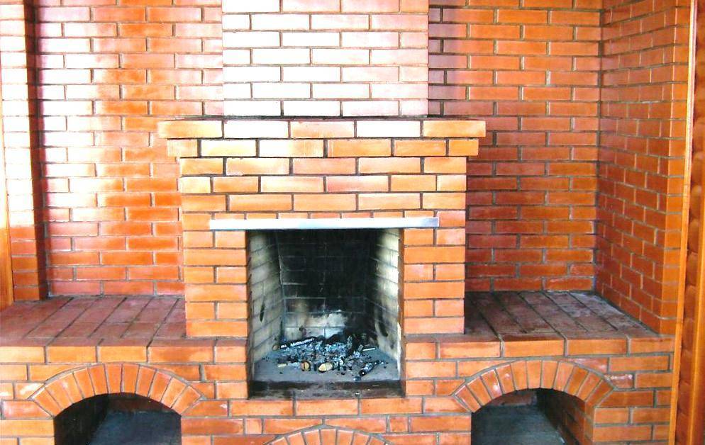 Дровяной камин из кирпича может быть и пристенного типа. В этом случае дымоход обычно вмонтирован в стену или частично выступает за ее пределы. Сделать его можно даже в доме, где ремонт уже готов, так как демонтаж поверхности не потребуется.