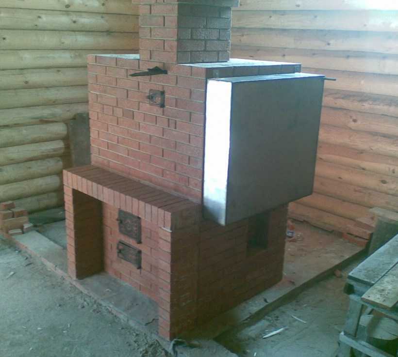 Эта модель обеспечивает быстрый нагрев, как каменки, так и воды внутри бака. При этом увеличивается расход дров, поскольку распределение тепла идет на два источника нагрева одновременно. Выкладывается такая печь в 21 ряд с применением стального щита для отделения каменки.