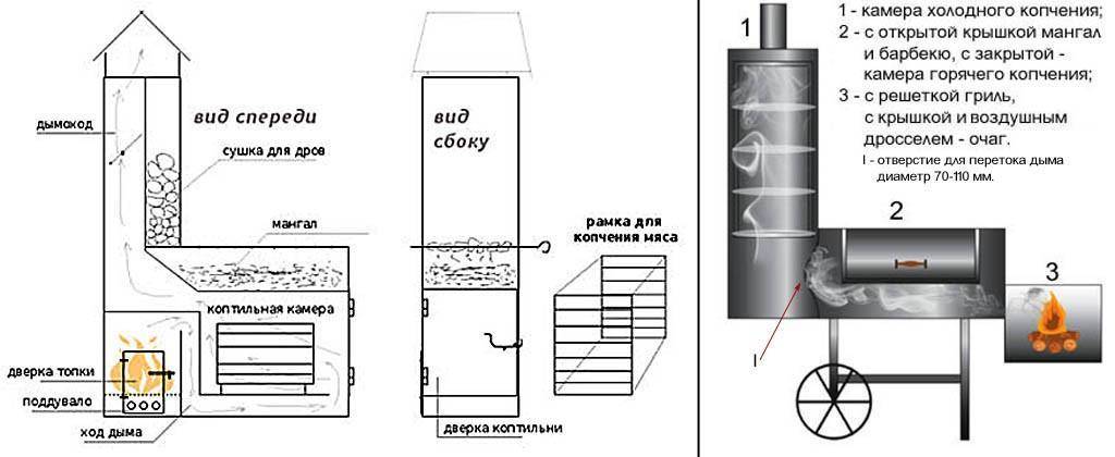 Некоторые умельцы предлагают усовершенствовать конструкцию с трубой, ввиду того, что она во многом зависит от качества дров. Если дрова, использующиеся для топки будут влажными, то на продуктах может образоваться конденсат и не очень приятная корочка. Если же сделать топку двухкамерной, с отдельным дымоходом, то можно в первой камере жечь дрова, независимо от их качества, а во второй расположить ароматную щепу, которая и будет давать нужный для копчения дым.