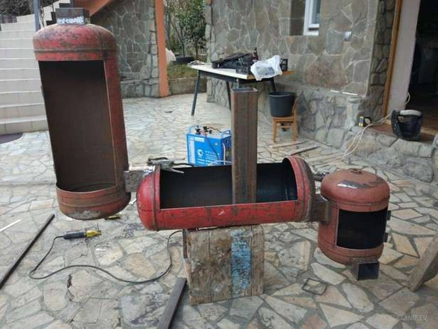 Понадобятся 2 газовых баллона — один побольше, другой меньших размеров, стальные трубы диаметром 80-100 мм, ручки для крышек, решетки, можно от барбекю. Для работы нужен инструмент: сварочный аппарат, приспособление для резки металла. Предварительно оборудуют место под коптильню и сваривают несущий каркас.