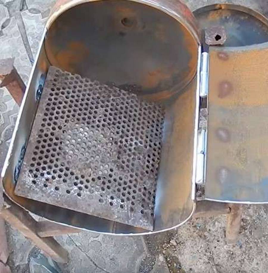 Кроме того, в верхней части необходимо проделать отверстие для дымохода. Он будет необходим при начальной растопке коптильни. Впоследствии же труба будет закрываться.