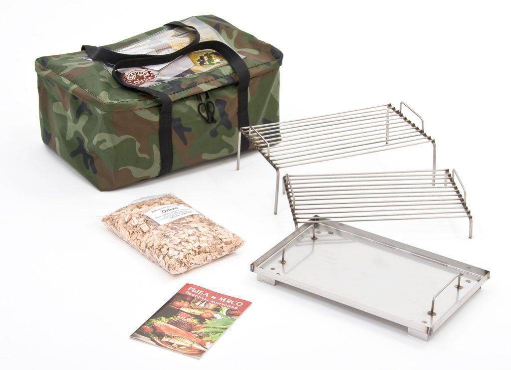 На дно емкости помещается щепа, сверху устанавливается поддон, в который будет стекать жир, образующийся в процессе нагрева продуктов, а над поддоном располагается подготовленное мясо или рыба.