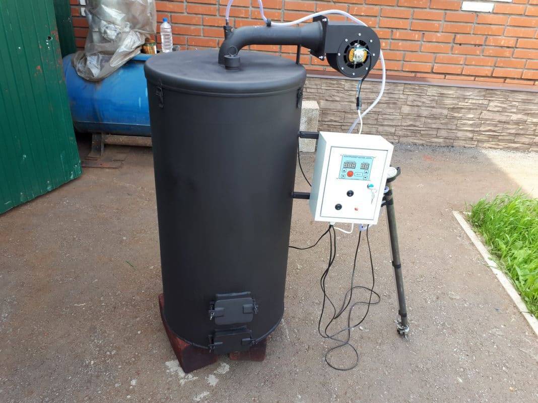Горение осуществляется во внутреннем объёме печи, ограниченном металлическим цилиндром. Это наша камера сгорания – сверху в неё поступает воздух, в верхней боковой части располагается отвод под дымоход. На представленном чертеже изображён агрегат с поддувом, что делает его работу более эффективной. Водяной рубашки здесь нет, но есть вентилятор обдува, который обдувает воздухом внутренний цилиндр с камерой сгорания. Горячий воздух можно отправить через воздуховоды в обогреваемые помещения.