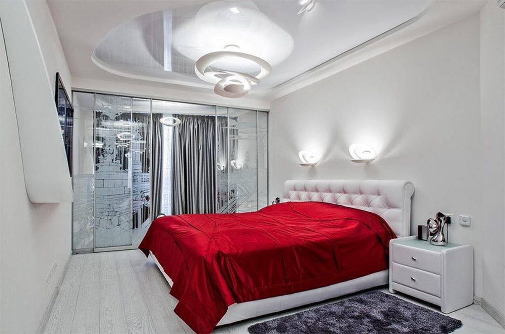 - При наличии функциональных зон стоит продумать освещение каждой из них отдельно. Например, в шкафу-купе можно сделать освещение, которое включается при открывании двери или же поставить датчик движения. Туалетный столик подсветите настенными элементами или используйте зеркало со светодиодами.
