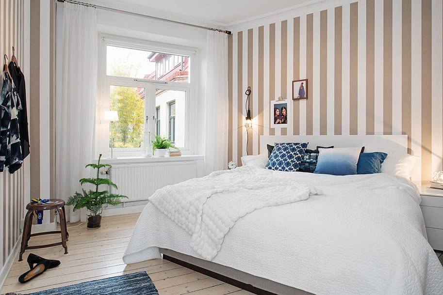 Геометрические узоры также отлично подходят – вертикальные полосы поднимают потолок, а горизонтальные делают спальню шире.