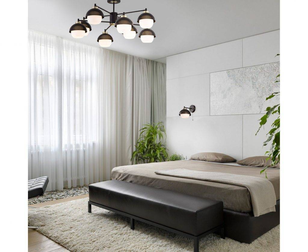 В качестве освещения рекомендуется применить лампочки настенного типа. Такое решение позволит разгрузить комнату.