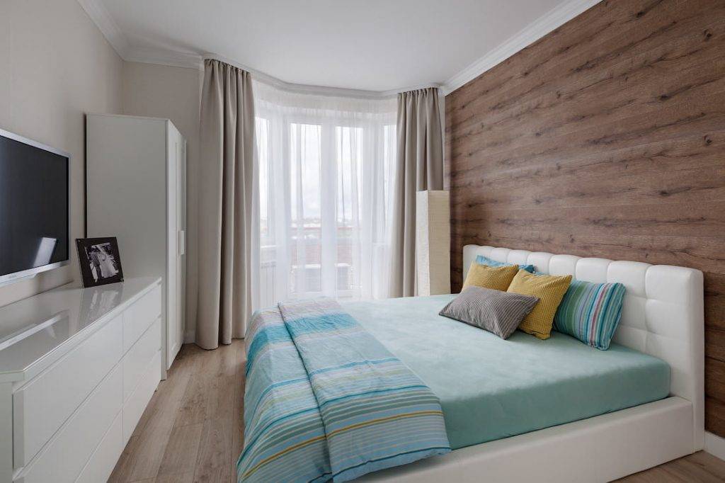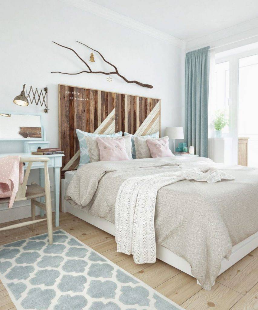 Такая атмосфера освежит юго-западные комнаты. Подход к оформлению помогает зрительно расширять пространство. Популярно выполнение отделки стены с изголовьем кровати деревянными панелями. Такой ход удачен для узкой комнаты.