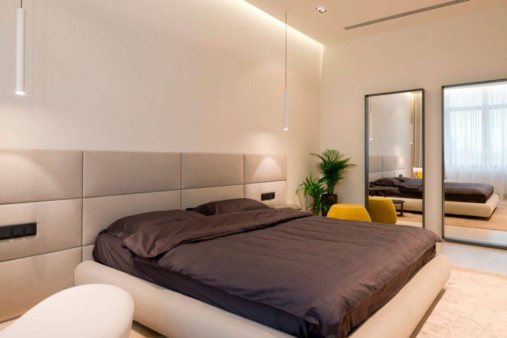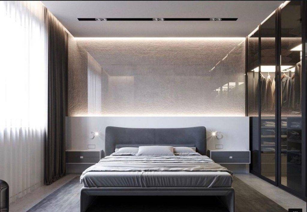 - Используйте подсветку (потолка или пола по периметру, эффект парящей кровати и т. д.) — с ее помощью можно изменить восприятие помещения.