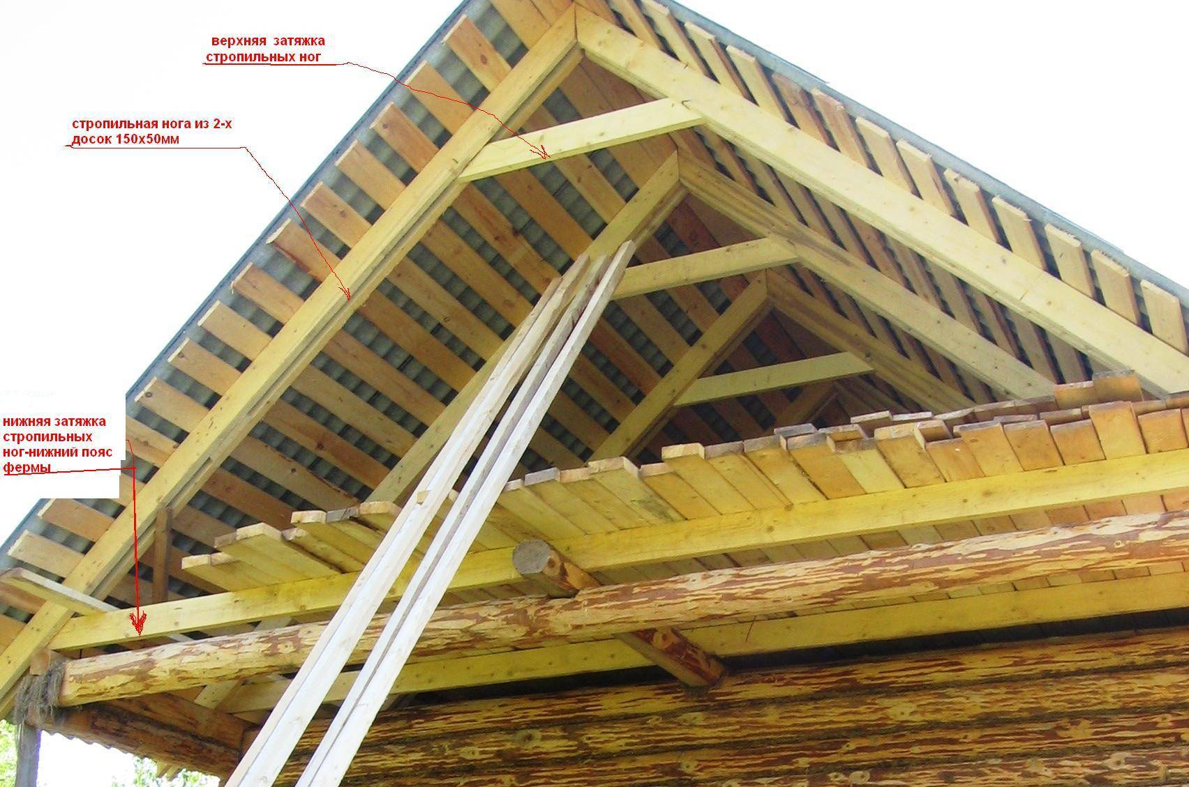 - Монтируем стропила из дерева на опору при помощи деревянных или металлических накладок. Стропила могут иметь форму досок, бревен или брусьев. Расстояние между ними должно быть меньше одного метра.