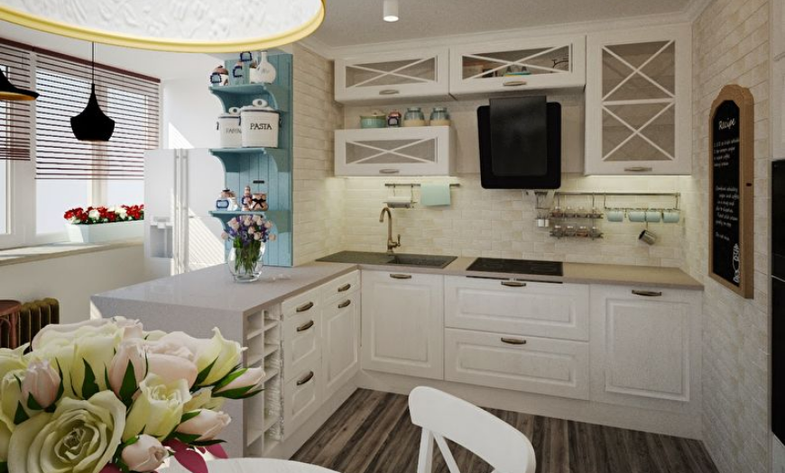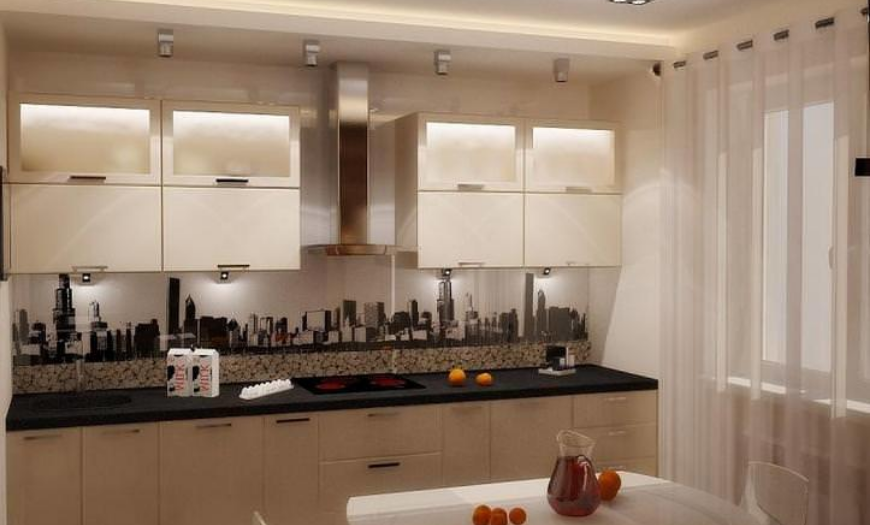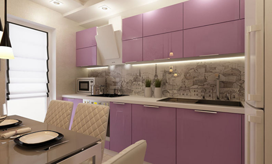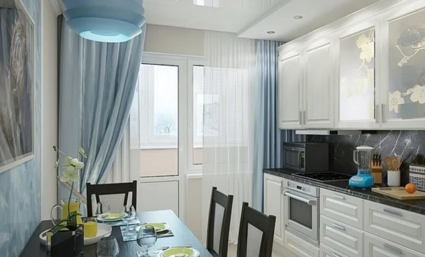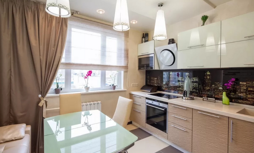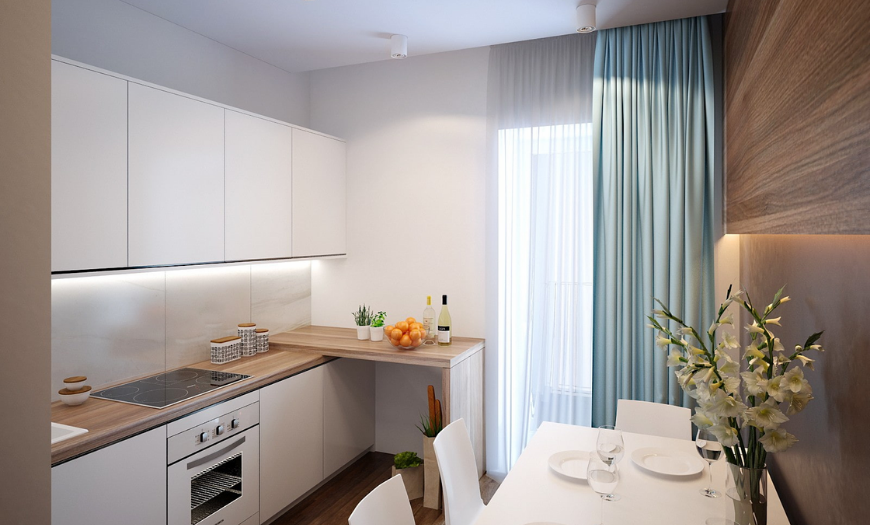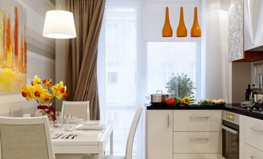 Дизайн такой кухни выполняется в результате перепланировки квартиры. Многим людям нравится завтракать, обедать, ужинать, сидя у окна. Это придает им новые силы, особенно при наличии живописного пейзажа рядом с домом. Учитывая, что площадь кухни маленькая, присоединенный к ней балкон или лоджия увеличивают ее. Сюда выносится обеденная зона.