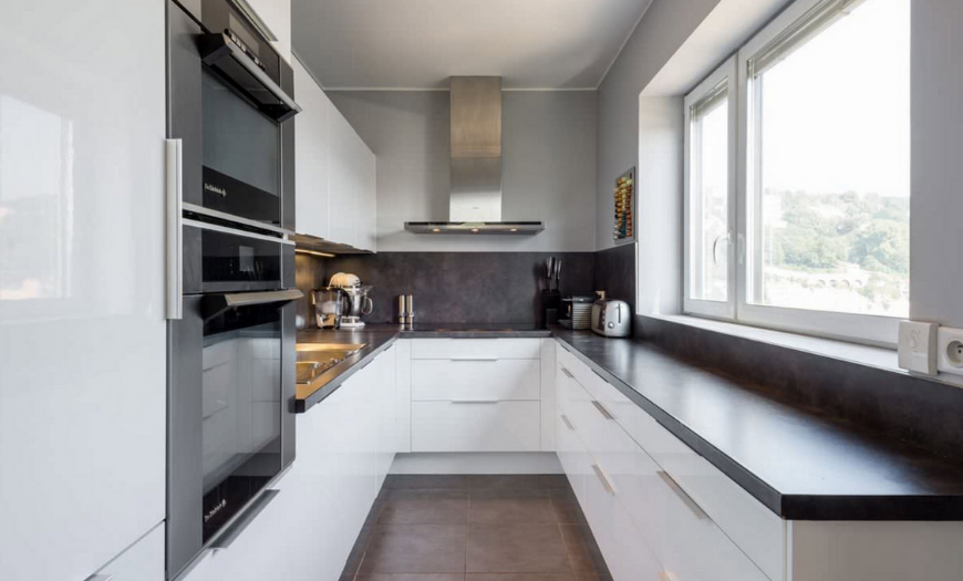 Такую кухню корректируют за счет установки вертикальной мебели – высоких пеналов, холодильника, духовки. Для вытянутой кухни подойдет установка гарнитура линейным способом с встроенной техникой, то есть вдоль стены. Холодильник и плиту ставят по разные стороны от мойки. Благодаря такой расстановке напротив гарнитура остается свободное место для столовой зоны. Также в узкую кухню можно поставить П-образный гарнитур. Но он подойдет только, если не нужно обустраивать столовую зону.