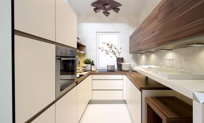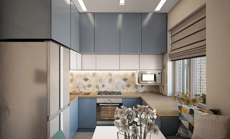 В дизайне такого помещения должно быть два окна или специальная планировка. При недостатке места для размещения мебели используйте все плоскости, расположенные по вертикали. Целесообразно и практично будет, если вы установите встроенную мебель с навесными шкафчиками до потолка. В этом случае будет сэкономлено место и скрыты за фасадом гарнитура все трубы, счетчик, газовая колонка.