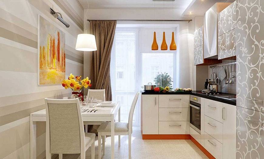 Интерьер кухни, фото 9 кв. метров — фото в панельном доме Плитка – один из самых популярных материалов для кухонной отделки. Кафельную или керамическую плитку с однотонным дизайном, рельефными узорами или цветными рисунками можно проложить на полу или наклеить в рабочей зоне кухонного интерьера. Лучше всего плитка сочетается с обоями, поэтому подумайте о возможностях сочетания разных фактур и цветов.