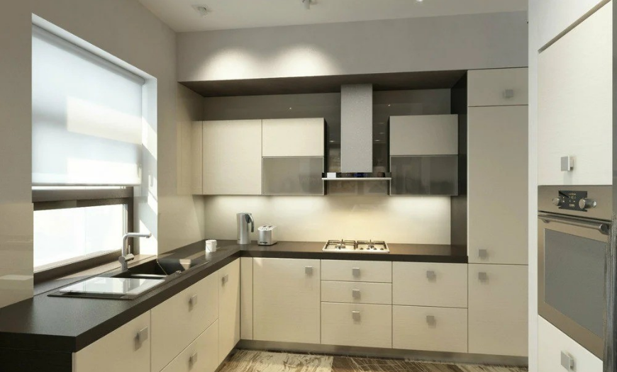 Такая планировка, когда кухонный гарнитур размещен вдоль трех стен, для кухни площадью 9 кв. м не подойдет. Свободного пространства на обеденную зону не останется.