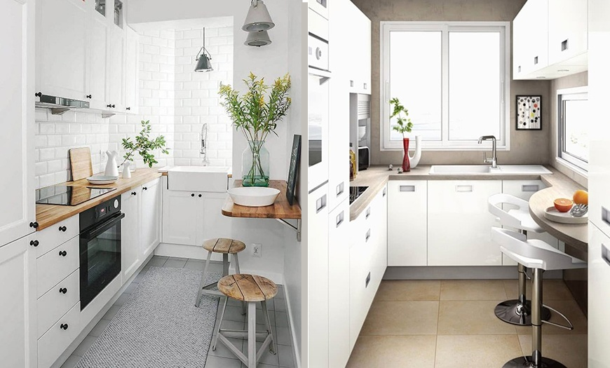 В обеденное пространство устанавливают небольшой портативный или раскладной стол. Некоторые предпочитают использование барной стойки, которую также используют, как дополнительную рабочую поверхность. Также столовую зону можно организовать у окна, переделав подоконник на стол.