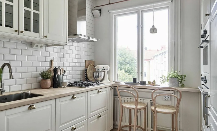 В помещение такой планировки хорошо впишется откидной стол или стол-подоконник, который позволит увеличить пространство кухни. Можно из части оконного проема сделать барную стойку и использовать ее как рабочую поверхность или обеденный стол.