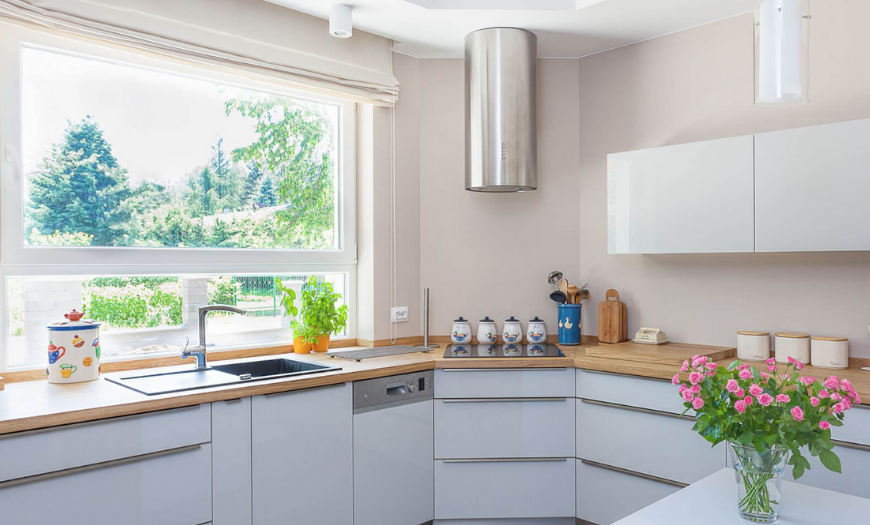 Если есть окно, его обязательно нужно выгодно использовать. Зачастую к окну переносят мойку для увеличения рабочей поверхности. Правда для этого придется удлинять трубы.