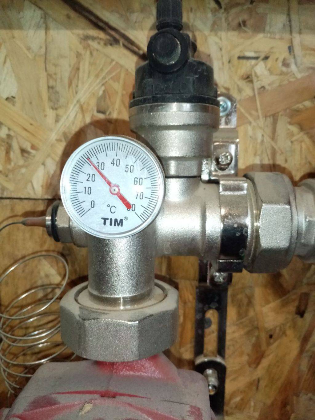 ![]() | Обязательным для водяных теплых полов считаю применение насосно-смесительной группы. Термостатическая головка в комплекте позволяет установить поддерживаемую температуру теплоносителя. Термометр позволяет визуально контролировать температуру. |